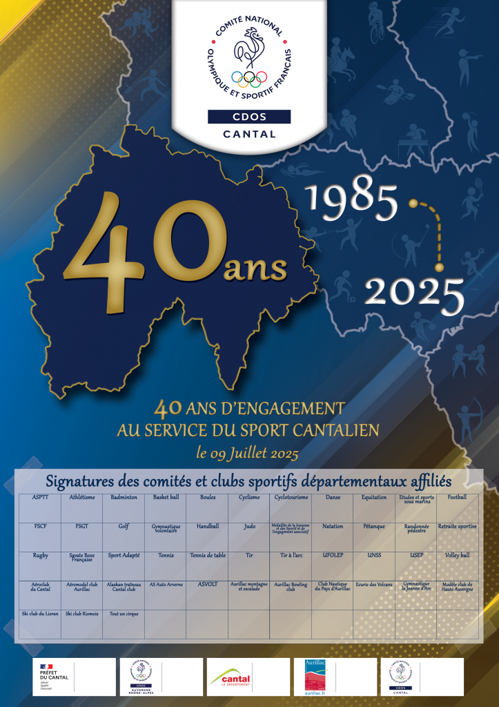 Une affiche commémorative a été spécialement réalisée pour l’événement, afin d’être signée par les élus ainsi que par les représentants des comités départementaux ou des clubs sans comité, adhérents au CDOS Cantal, venus en nombre pour l’occasion.